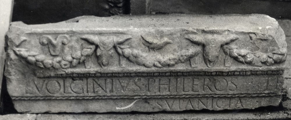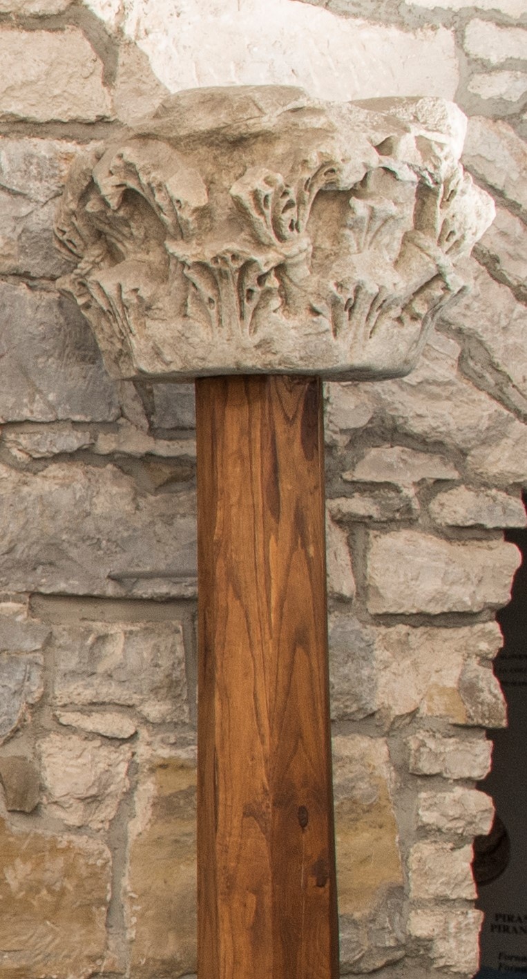 Beams or architraves, which lay on the columns' capitals, were also decorated. In Strunjan, part of a Roman architrave, dated to the 1st half of the 1st century AD, was found. Its front side is richly ornamented with a curved garland; the adornment is composed of different fruits and field products and hanging on the horns of ox skull. In the middle of the garland, birds and bird motifs are depicted alternately, while at its bottom the name of the owner of this architectural structure or the name of the person in honour of which it was made.