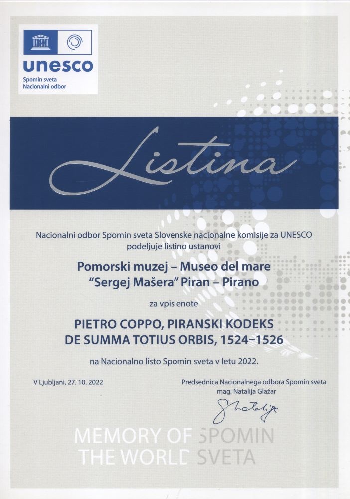 Na obeh dogodkih je bil za krajši čas v središču pozornosti dragoceni izvirni De summa totius orbis, ki vsebuje dva rokopisa in 15 tiskanih lesoreznih kart. Nadja Terčon iz Pomorskega muzeja Piran je na obeh dogodkih predstavila vsebino in materialno podobo Coppovega Piranskega kodeksa in vse aktivnosti Pomorskega muzeja Piran v zvezi z njim.