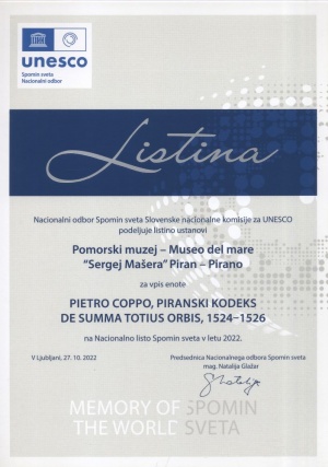Kodeks je edinstven primer na svetu in ga hranimo v Pomorskem muzeju v Piranu. Leta 2022 je bil Piranski kodeks vpisan na Slovensko nacionalno listo – Unesco program Spomin sveta med prvih deset najdragocenejših dokumentov v Republiki Sloveniji.